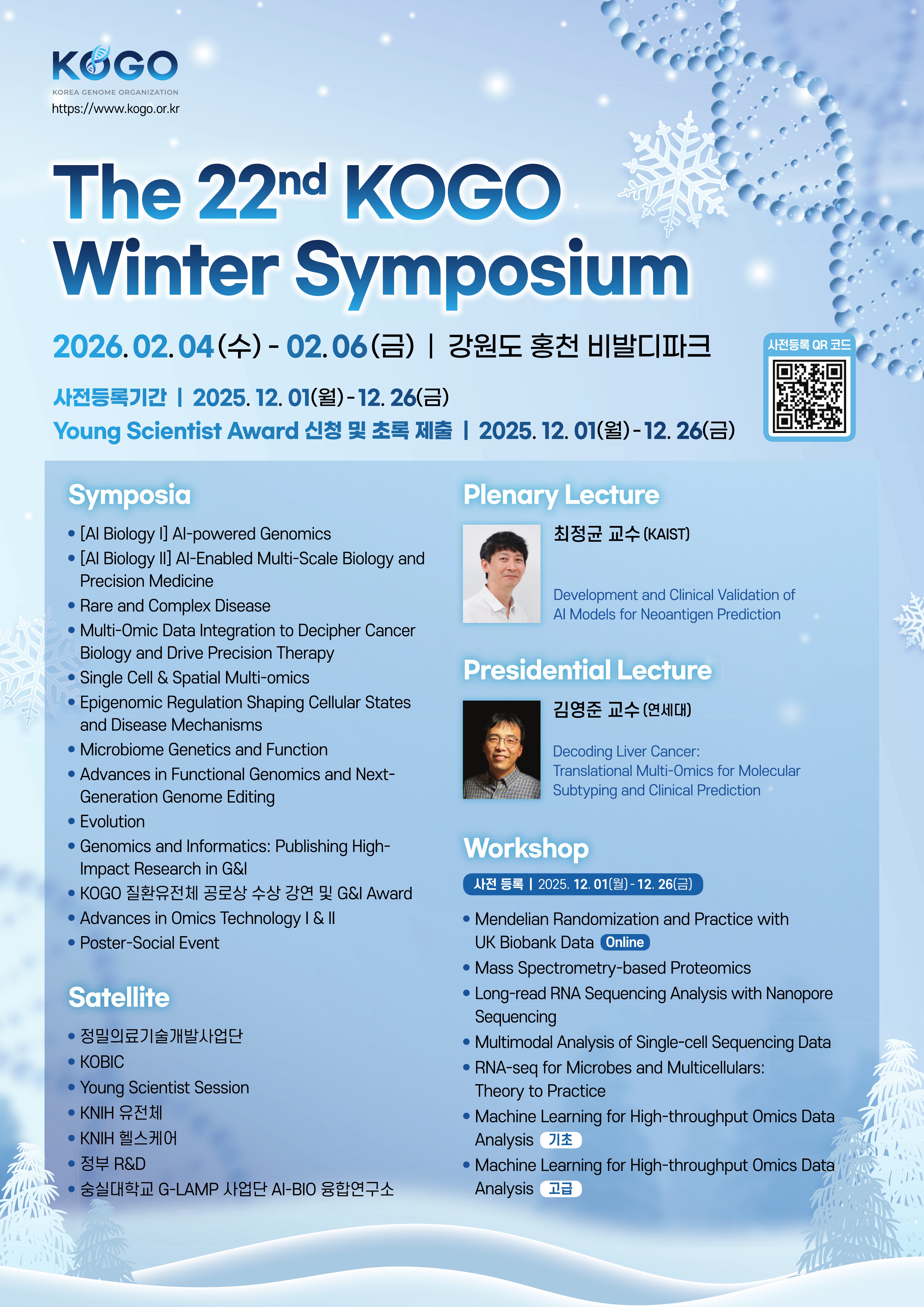 안녕하세요.한국유전체학회 사무국입니다.2023년 제17회 통계유전학 워크샵 장학생 선정 결과를 공지합니다.총 21명의 장학금 신청자 중 교육위원...